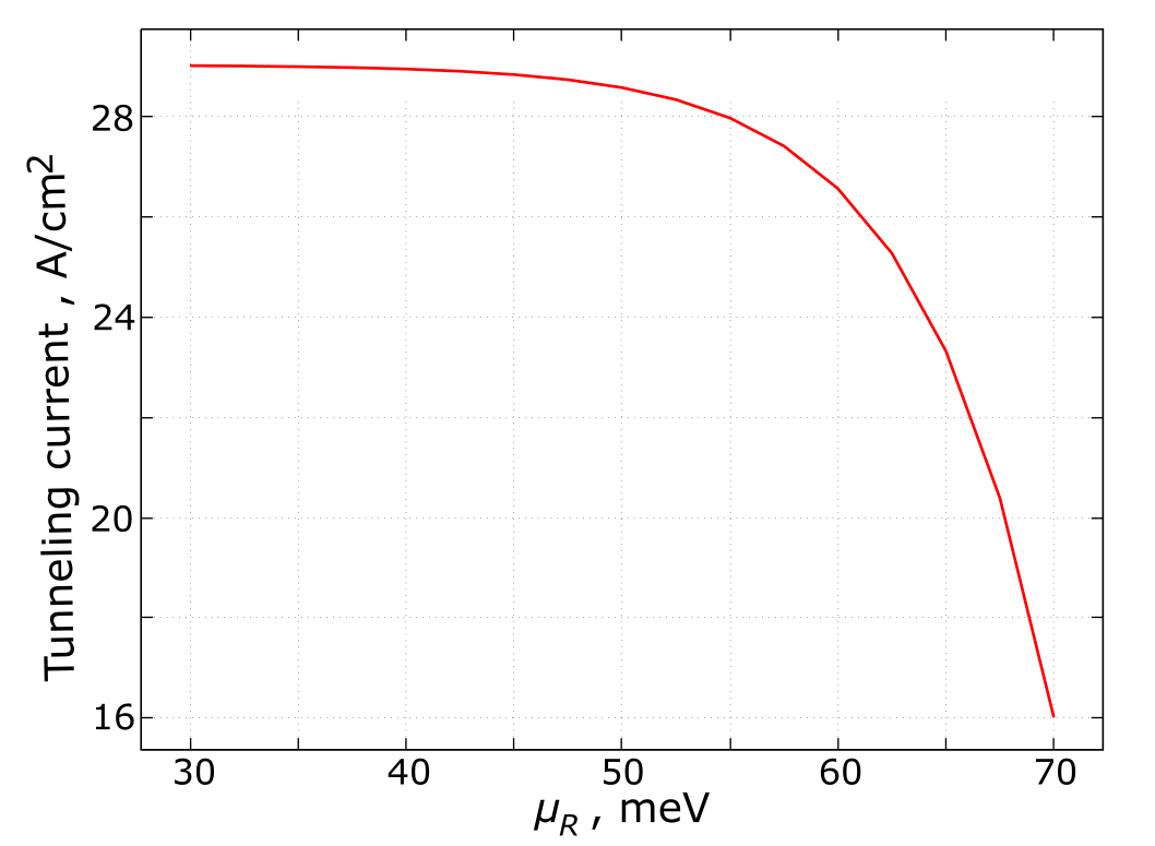 Figure 2.5.24 Dependence of the tunneling current on the chemical potential \(\mu_R\) at \(T=0 {\rm~K}\) at fixed value of \(\mu_L = 75 {\rm~meV}\). The DC bias is \(V_{dc} = \mu_L - \mu_R\). The length of the connecting wires has been chosen as 1 nm. Other parameters are the same as in Figure 2.5.22.