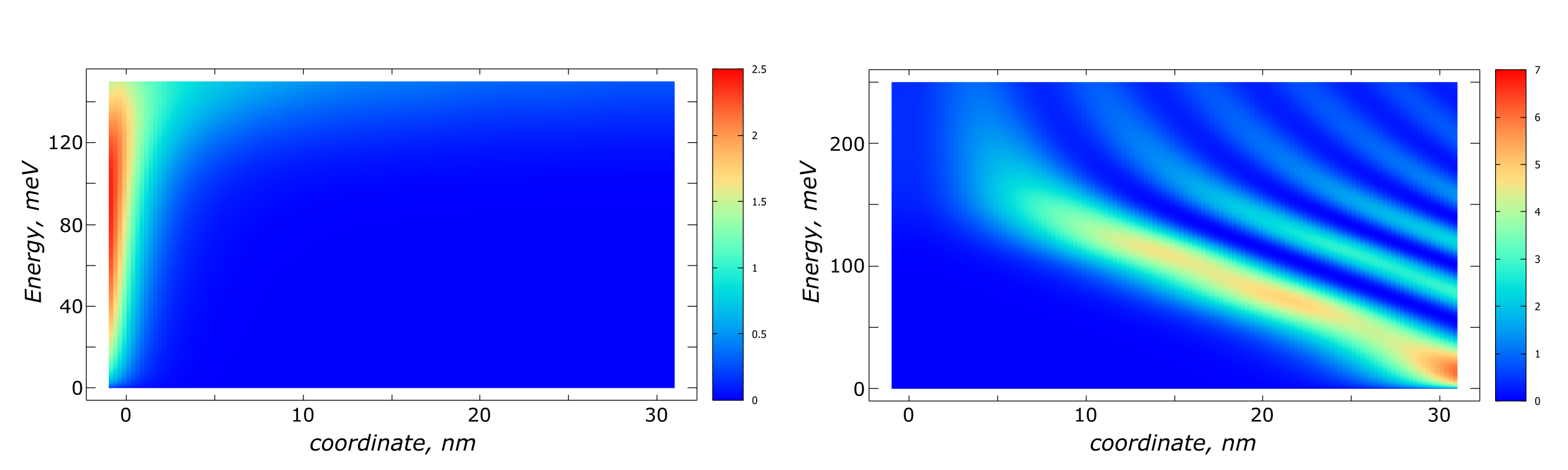 Figure 2.5.23 Local Density of states which illustrates how lead modes enter the device when only one lead (the left/right lead in the left/right panel) is connected. Mind the different scale of the color scheme in the left and right panels.