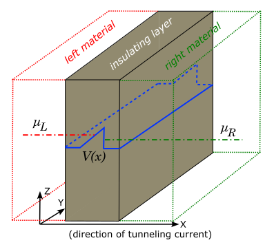 Figure 2.5.20 Sketch of a setup for the tunneling current in the Fowler-Nordheim theory. Left (red lines) and right (green lines) materials with different chemical potentials, \(\mu_{L,R}\), are separated by an insulating layer (brown region) which makes a potential barrier (blue lines). Everything is homogeneous in {y, z}-directions. The tunneling through the potential barrier occurs in x-direction.