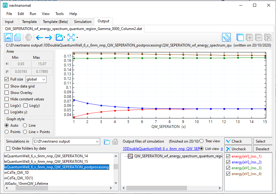 If you have already done some sweeps in the past, you can also use the post-processing feature of nextnanomat retroactively. Note, additional to the post-processing steps described above, you need to load the correct template file and select and fill in the same variable values which have been used for the sweep.