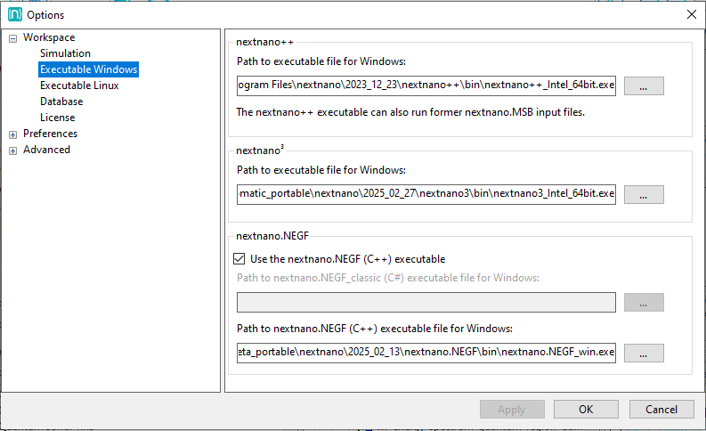 The paths to the nextnano tools can be specified here. Note, there are two tabs, one for the Windows and one for the Linux executables. When installing a package, the paths are automatically set at program start. If a specific version of a nextnano tool is downloaded, the path can be specified here. Please verify that you have the correct nextnano tool downloaded and specified, matching your license.