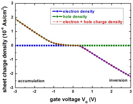 whereas in the inversion regime the electron density dominates the device