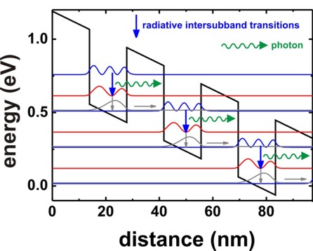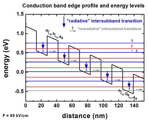 The basic idea of such a structure is to depopulate the lowest eigenstate of each quantum well efficiently by bringing it into resonance with the third eigenstate of the next quantum well (resonant tunneling).