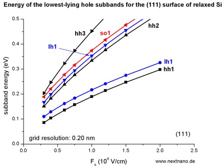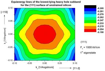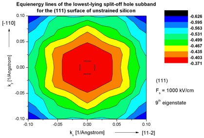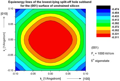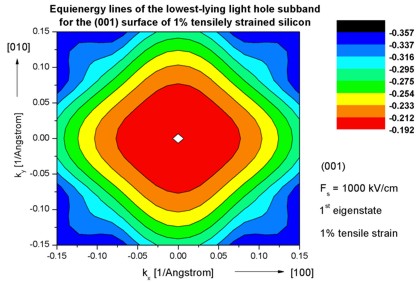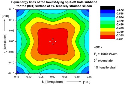 silicon calculated using a strain dependent 6-band k.p Hamitonian. Only one spin