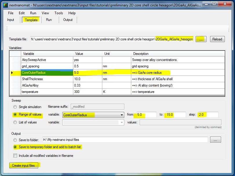 It is also possible to sweep over variables, like e.g. the outer radius of the GaAs core ("CoreOuterRadius") using nextnanomat's "Template" feature.