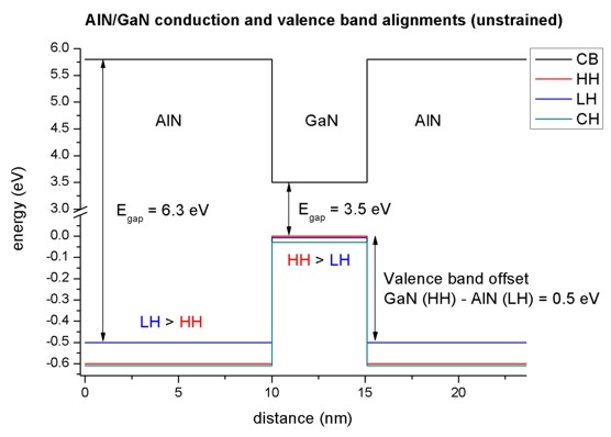 The following figure shows the conduction and valence band edge alignment in AlN/GaN structures (unstrained). In AlN, the light hole (LH) is the highest valence band whereas in GaN, this is the heavy hole (HH). We assumed a valence band offset of VBO = 0.5 eV, the conduction band offset is much larger (CBO = 2.3 eV). All material parameters are based on the paper